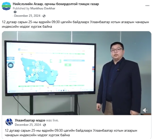 12 дугаар сарын 25-ны өдрийн Улаанбаатар хотын агаарын чанарын индексийн мэдээг хүргэж байна.