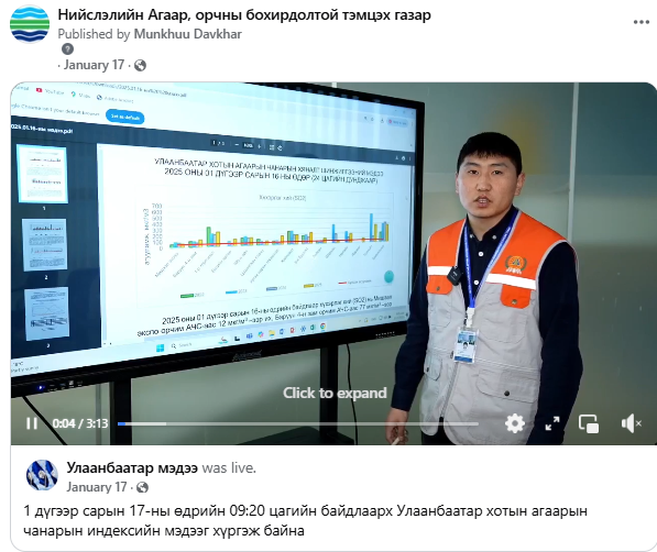 1 дүгээр сарын 17-ны өдрийн 09:20 цагийн байдлаарх Улаанбаатар хотын агаарын чанарын индексийн мэдээ