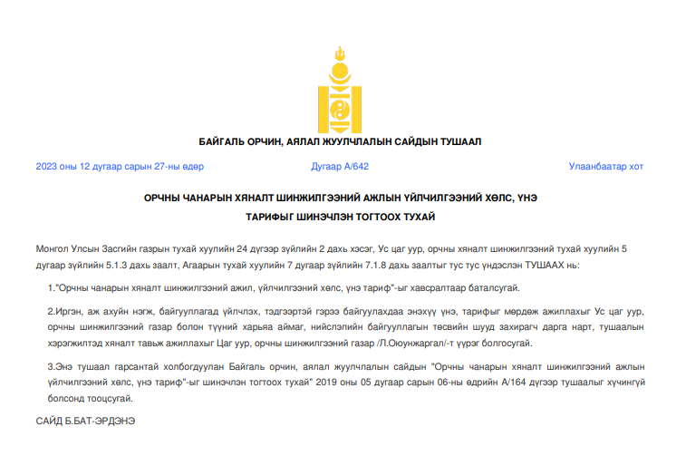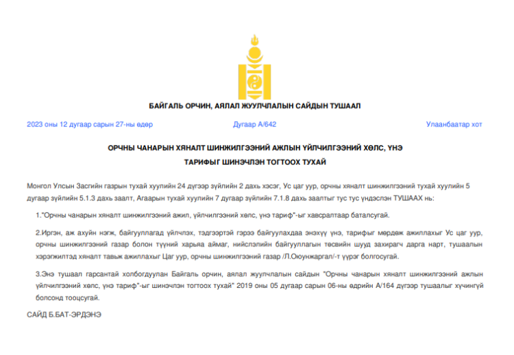 ОРЧНЫ ЧАНАРЫН ХЯНАЛТ ШИНЖИЛГЭЭНИЙ АЖЛЫН ҮЙЛЧИЛГЭЭНИЙ ХӨЛС, ҮНЭ ТАРИФЫГ ШИНЭЧЛЭН ТОГТООХ ТУХАЙ