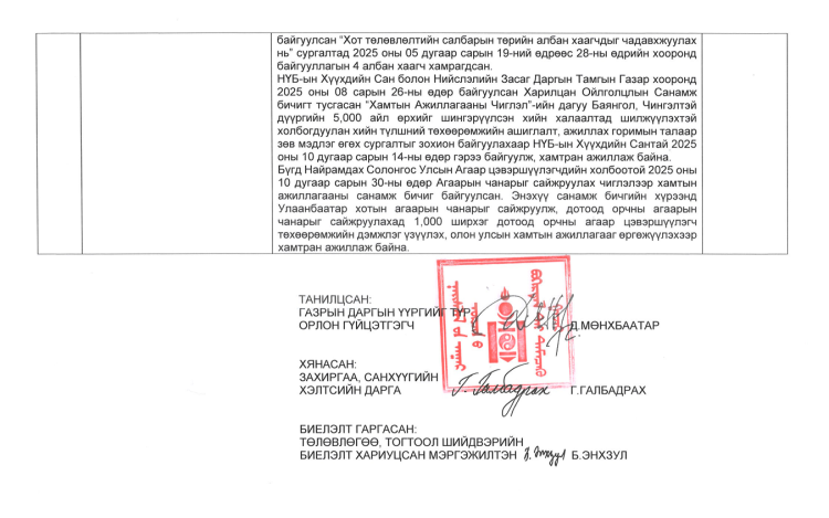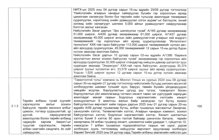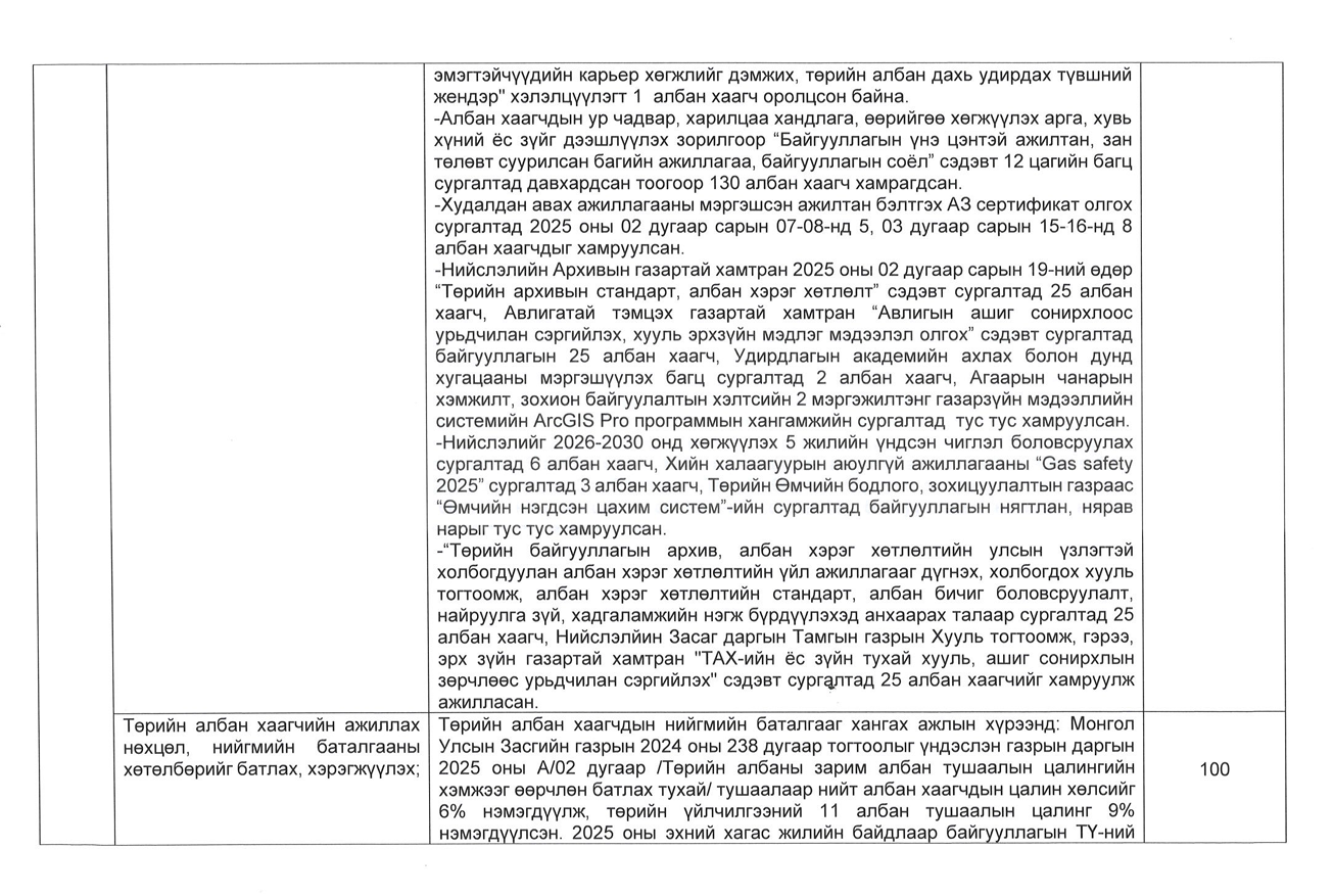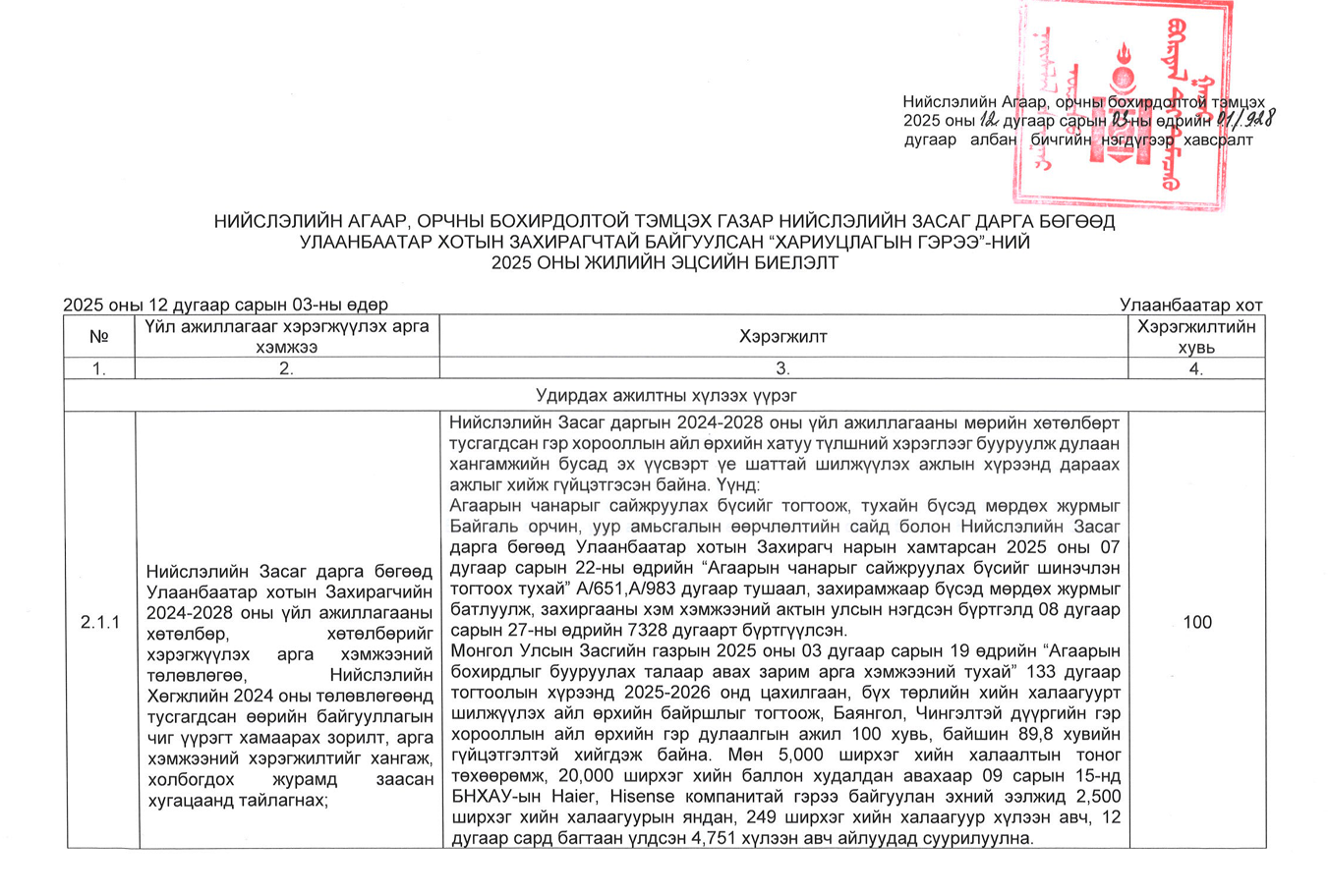 Нийслэлийн Агаар, орчны бохирдолтой тэмцэх газар Нийслэлийн Засаг дарга бөгөөд Улаанбаатар хотын захирагчтай байгуулсан "Хариуцлагын гэрээ"-ний 2025 оны жилийн эцсийн биелэлт