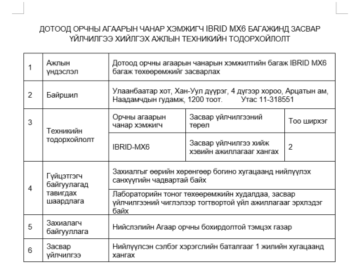 Дотоод орчны агаарын чанар хэмжигч ibrid mx6 багажинд засвар үйлчилгээ хийлгэх ажлын даалгавар